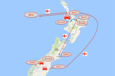 奥克兰>>陶波>>基督城>>福克斯冰川>>皇后镇>>蒂卡波>>基督城