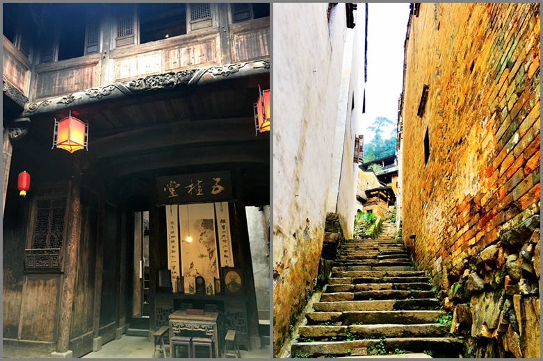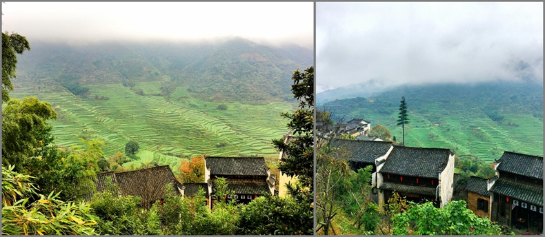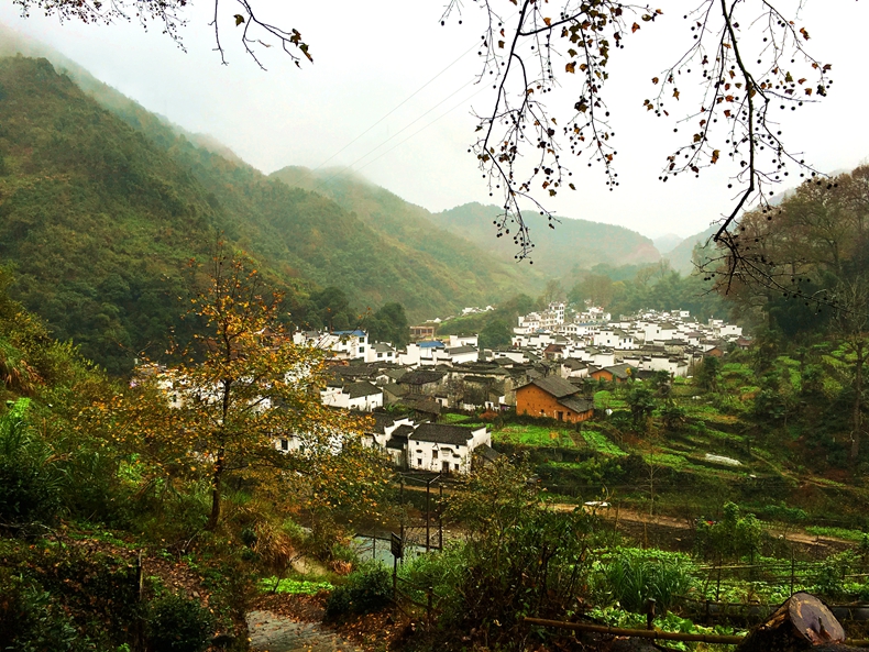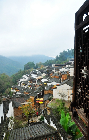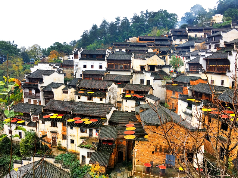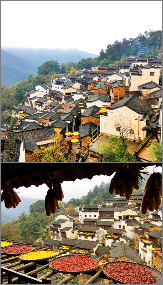 数十栋古老徽派民居在百米落差的岭谷错落排布,家家凿窗采光,户户支架晒物。村民们用眺窗为画板,支架为画笔,晒匾为调色盘,春晒山厥、水笋、夏晒干菜、果蔬;秋晒辣椒、黄豆;东晒果脯、乡俗,一年四季延绵有序。