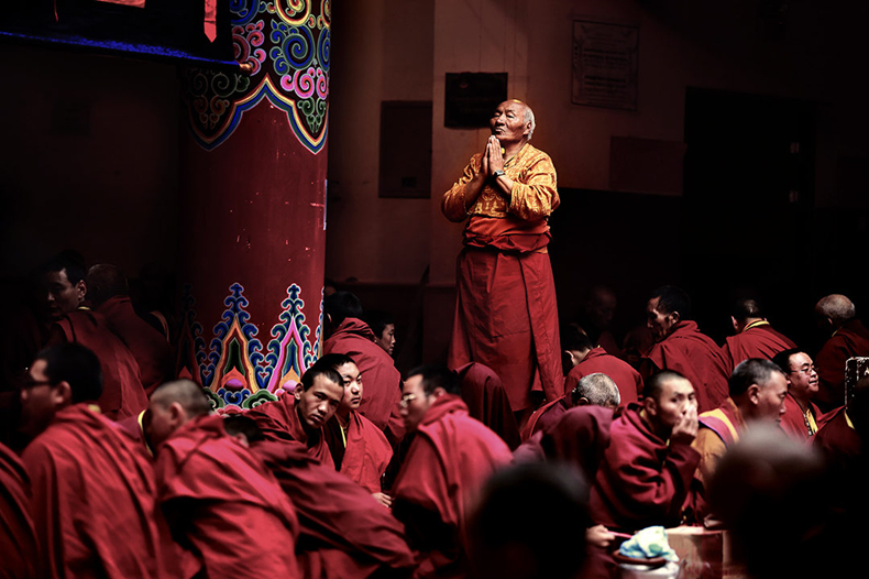 你感觉里,辩经是这样,几十名喇嘛分为一对一、一对多,或者多对一的各种组合。站立者藏语发问,席地者则藏语答辩,辩论话题涉及藏教佛学的各个方面。问题一出,席地者必须不加思索地作出回复,进行反驳或解答。