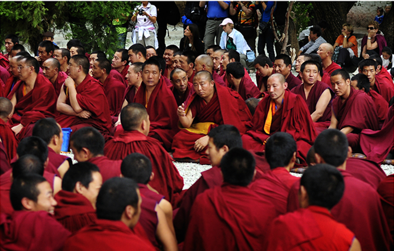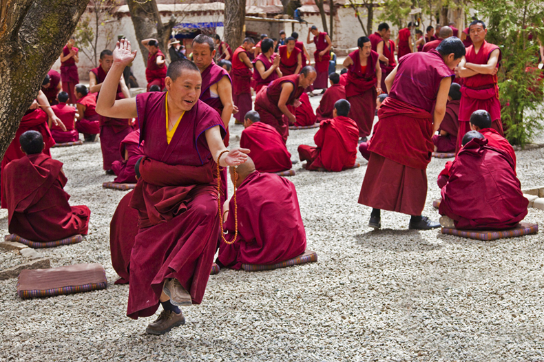 但可能,随着辩经活动的深入,他们会采用各式各样的手势和丰富的肢体动作,甚至怒目而视、手挥念珠、单脚独立并大力击掌以壮声威。他们或在提问时高举手臂向下劈落;或拉动佛珠表示借助信仰的力量来战胜对方!内行看门道,外行看越闹。你会发觉这种交流精彩又有趣!